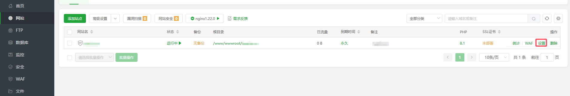 - 登录宝塔 Web 面板,单击网站,即可进入网站管理页面。