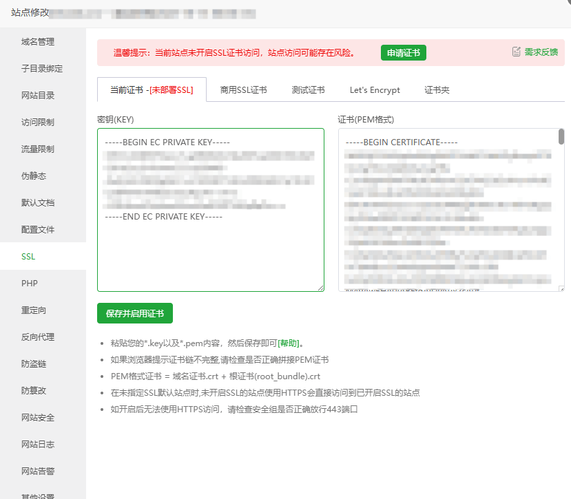 - 在弹出的站点修改窗口中,点击SSL > 当前证书,填写密钥以及证书文件,如下图所示: