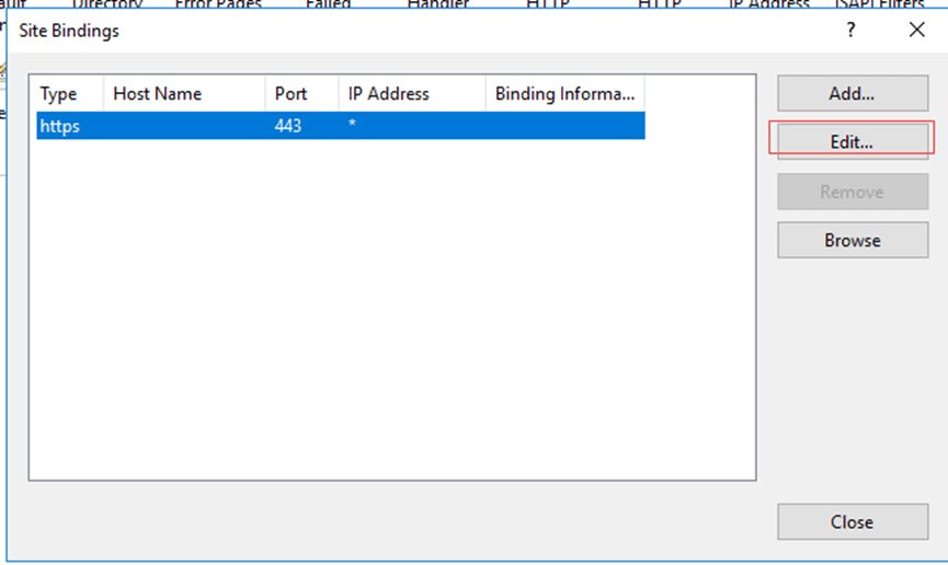 【站点绑定】窗口中,如果没有 HTTPS 绑定,请单击【添加】,如果已有HTTPS 绑定,请选中它并单击【编辑】,如下图所示: